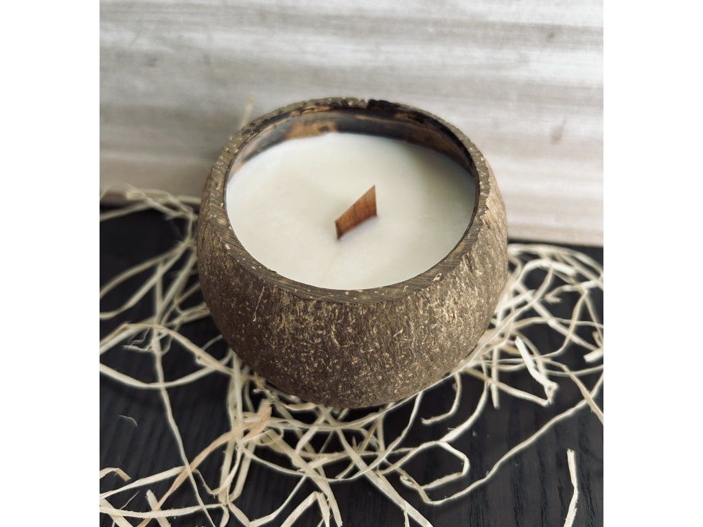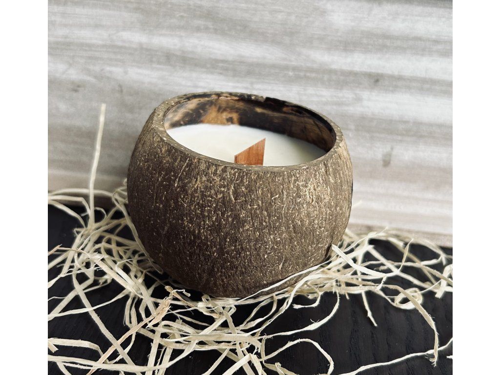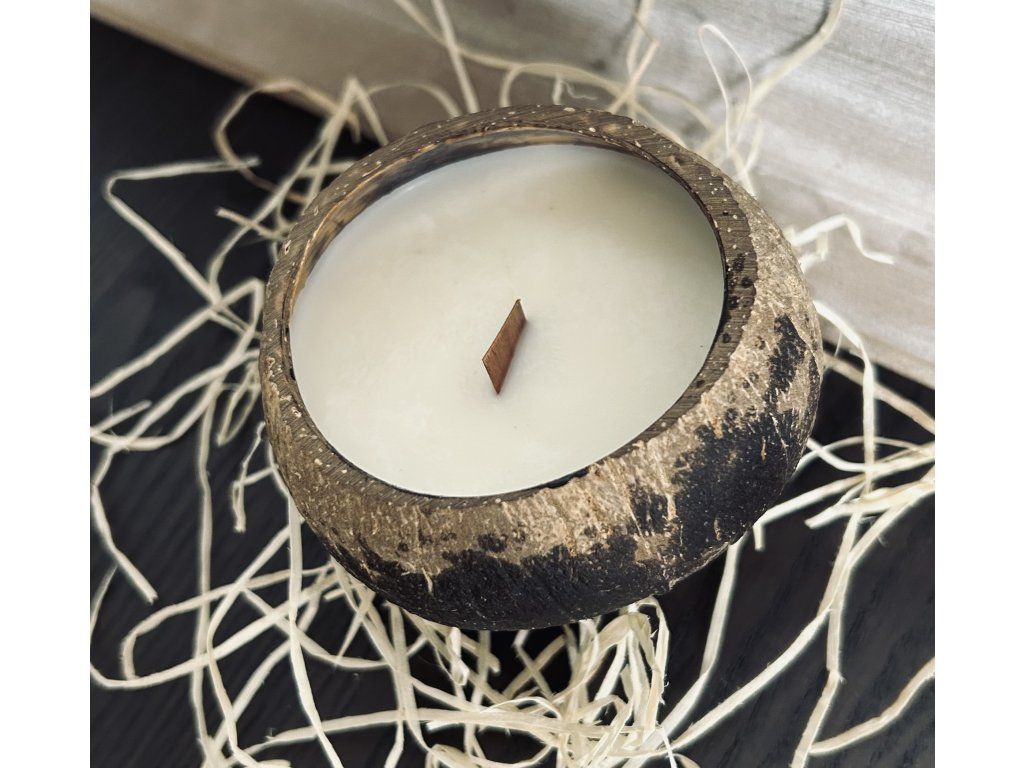 Svíčka je vyrobena z kvalitního, sójového vosku. Je vyletá do ručně broušené, kokosové skořápky. Skořápka je nařízlá ze spodní strany aby držela na místě. Dřevěný knot je stylový doplněk, který po zapálení dodá Vašemu domovu krásnou hramonii praskajícího dřeva.