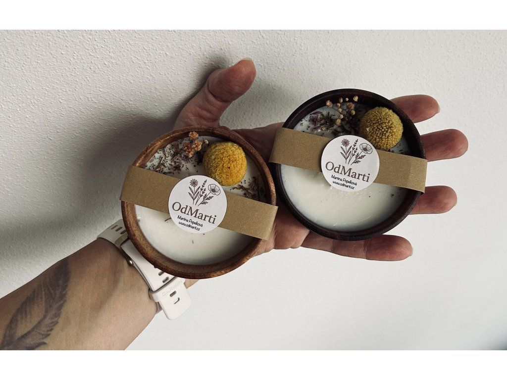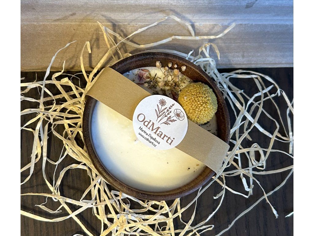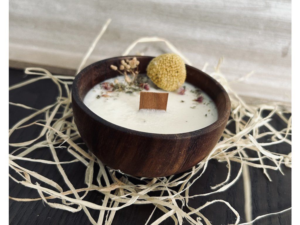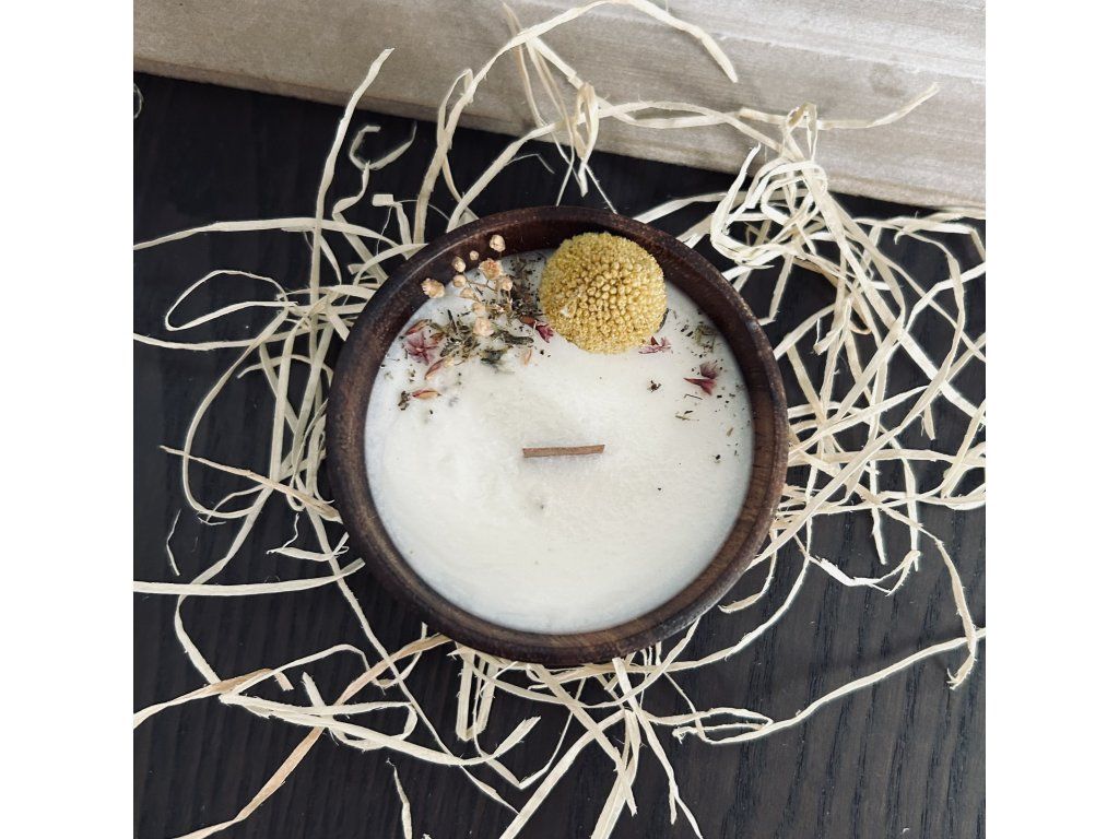 Svíčka z kvalitního, sójového vosku, doplněná sušenými květinami a dřevěným knotem. Svíčka je vyletá v krásné, dřevěné misce. Barva misky se může mírně lišit od fotografií.