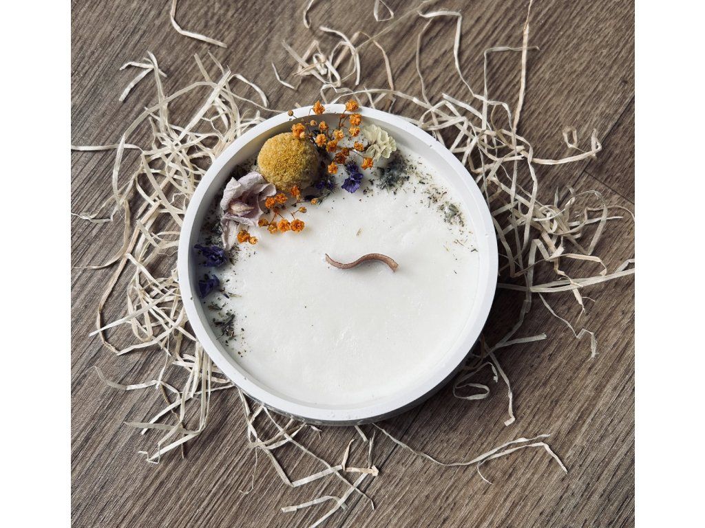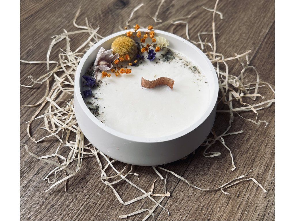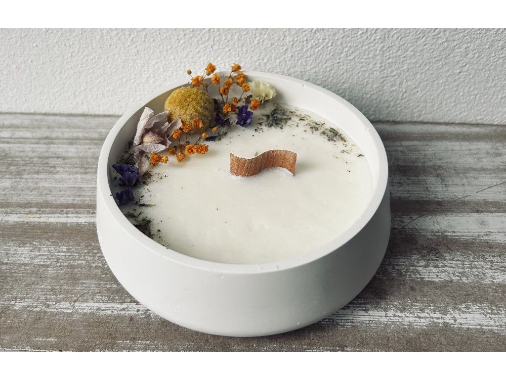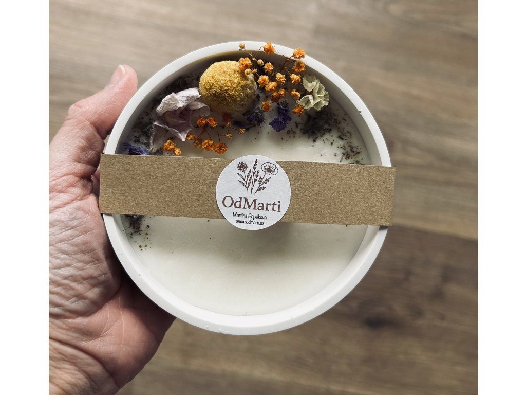 Svíčka z kvalitního sójového vosku, vložená do ručně dělané misky z vysoce odolného keraflottu. Svíčka je doplněna sušenými květinami, které svíčce dodají jemný a romantický design.