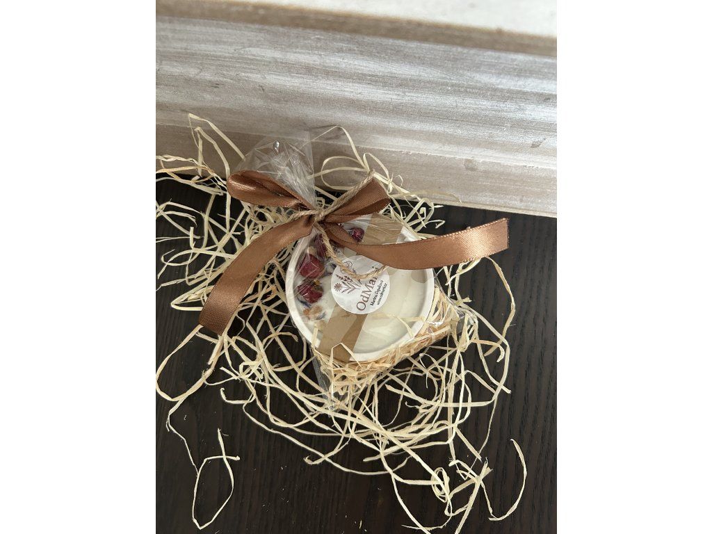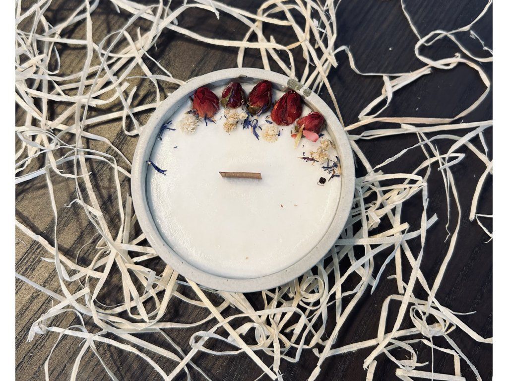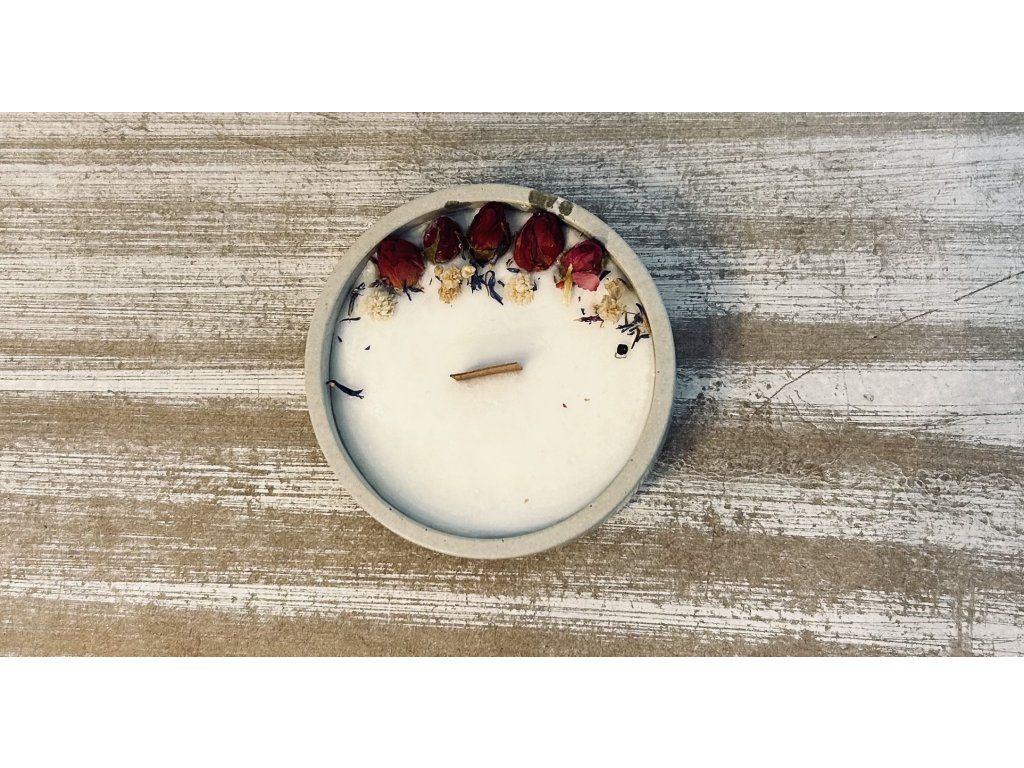 Svíčka je vyrobena z kvalitního sójového vosku a je vylitá v ručně dělané, bětonové misce.. Sušené květy dodají svíčce jemnější design.