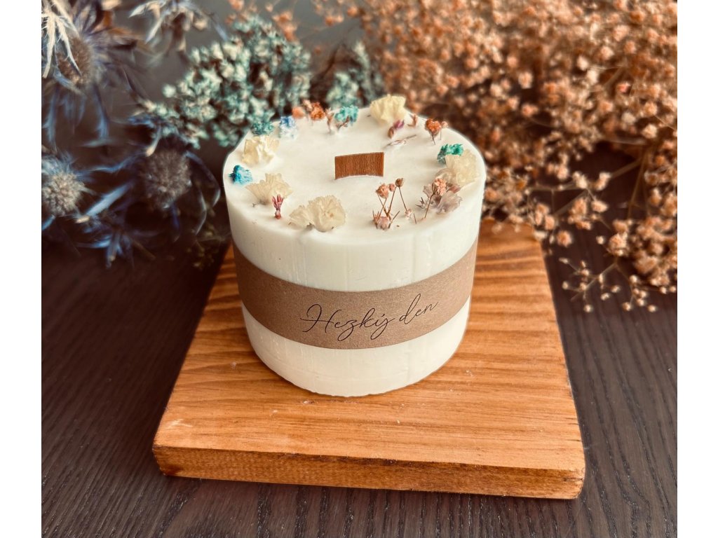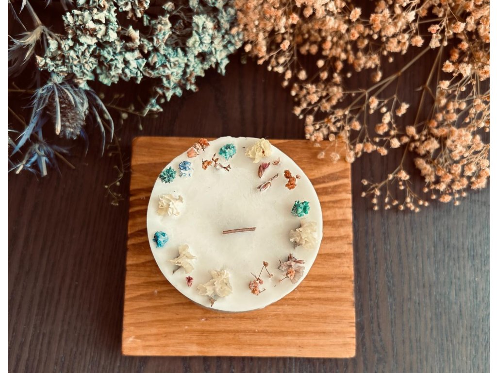 Originální ručně vyráběná svíčka ze 100% přírodního sójového vosku, zdobená sušenými květy a vybavená dřevěným knotem. Při hoření vydává jemný plamínek, který doprovází tiché praskání připomínající krbové dřevo – ideální pro chvíle klidu a relaxace.