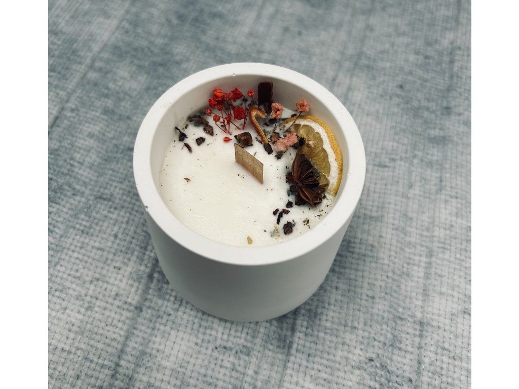 Ručně vyrobená miska z keraflott licí hmoty, vylitá kvalitním sójovým voskem. Svíčka je zdobená sušenými citrusy, sušenými květinami a plody a vánočním kořením.Po zapálení dřevěný knot vydává zvuky praskajícího dřeva, které Vám dodají relax a klid.