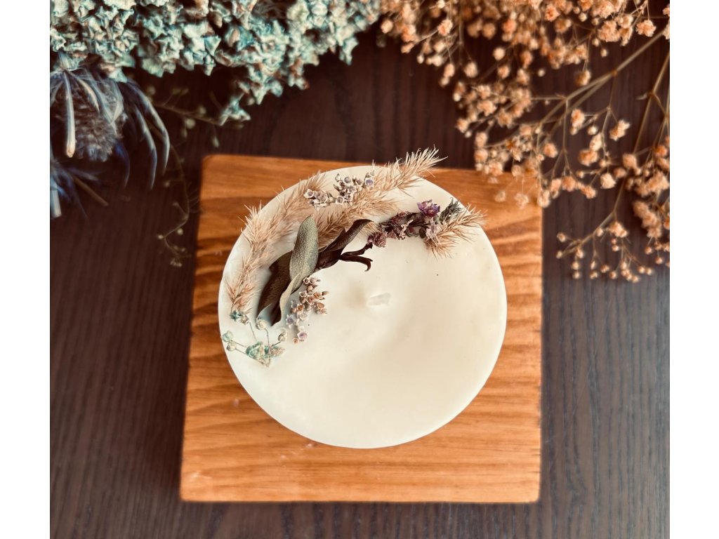 Originální ručně vyráběná svíčka ze 100% přírodního sójového vosku, zdobená sušenými květy a vybavená dřevěným knotem. Při hoření vydává jemný plamínek, který doprovází tiché praskání připomínající krbové dřevo – ideální pro chvíle klidu a relaxace.