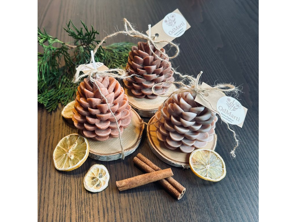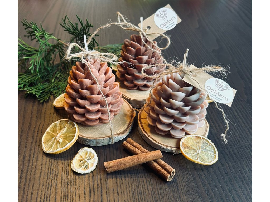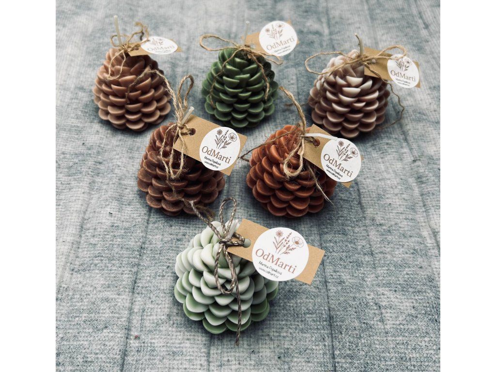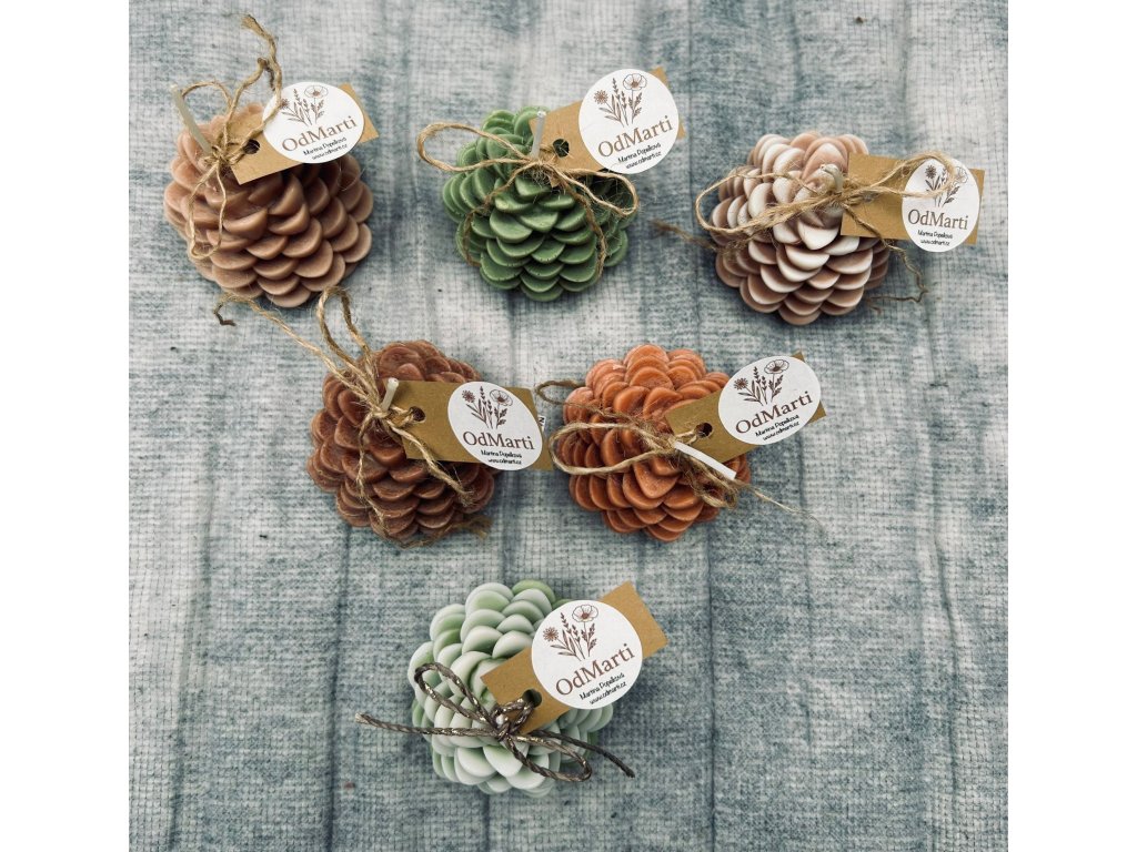 Každá svíčka ve tvaru šišky je ručně odlitá ze sójového vosku.