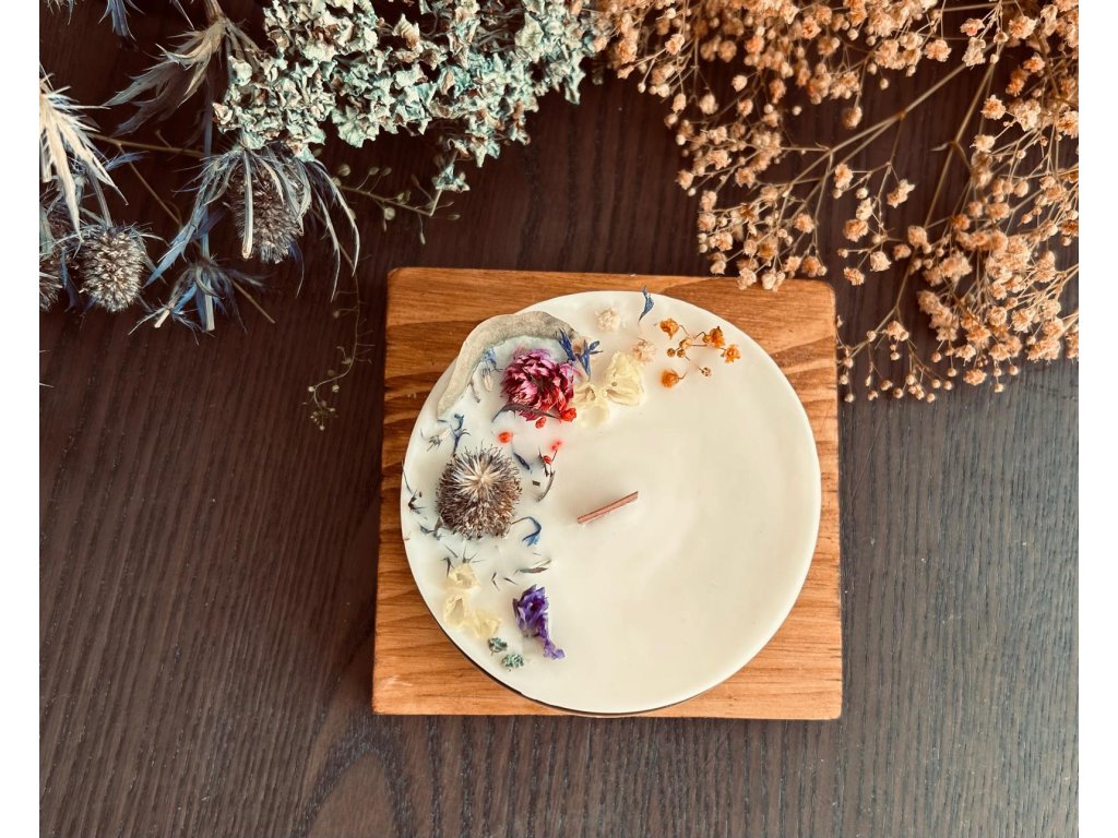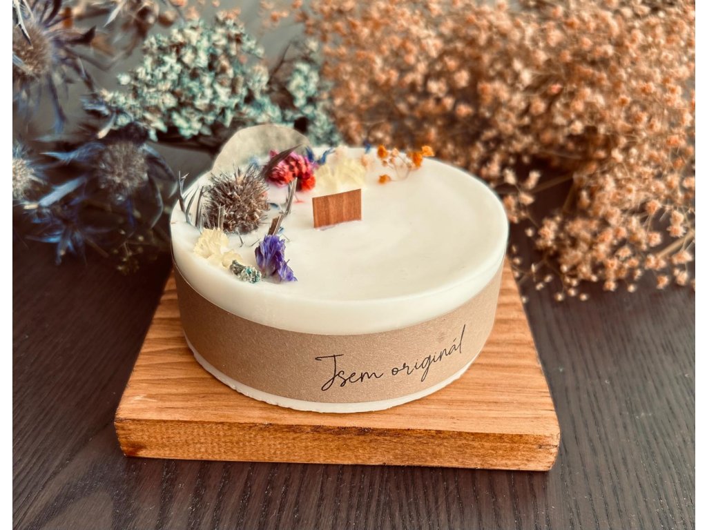 Originální ručně vyráběná svíčka ze 100% přírodního sójového vosku, zdobená sušenými květy a vybavená dřevěným knotem. Při hoření vydává jemný plamínek, který doprovází tiché praskání připomínající krbové dřevo – ideální pro chvíle klidu a relaxace.