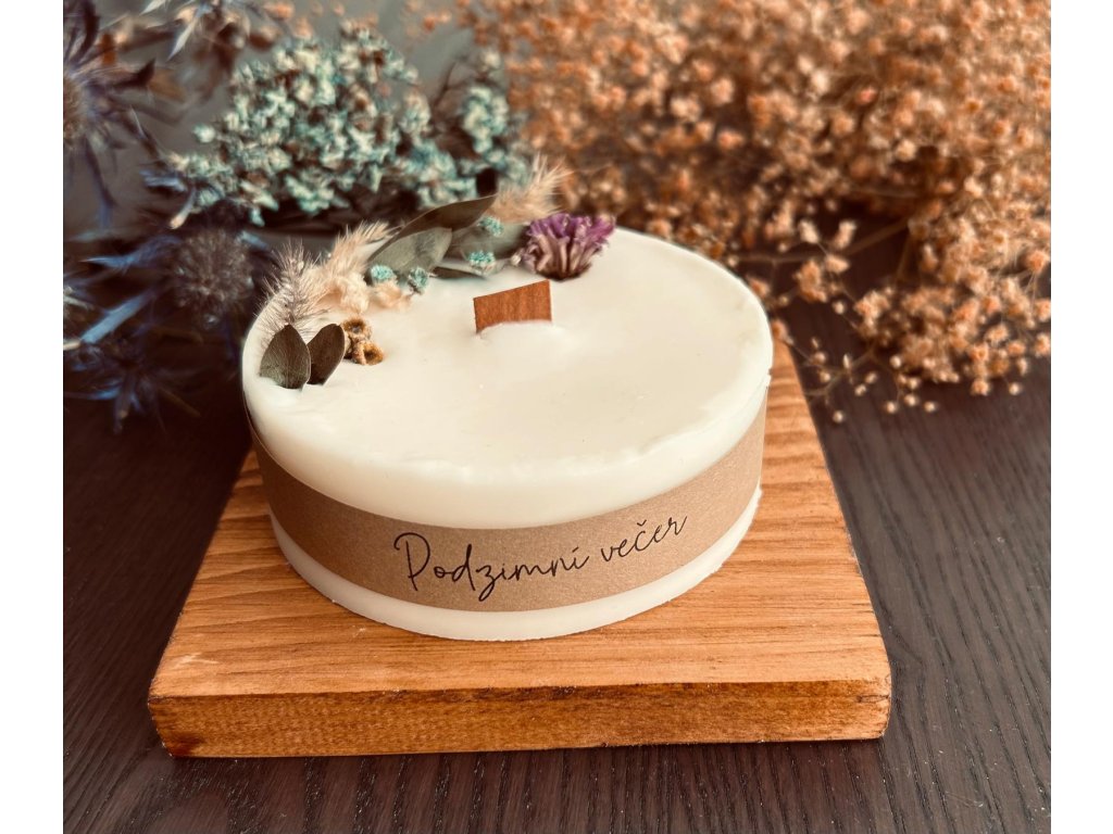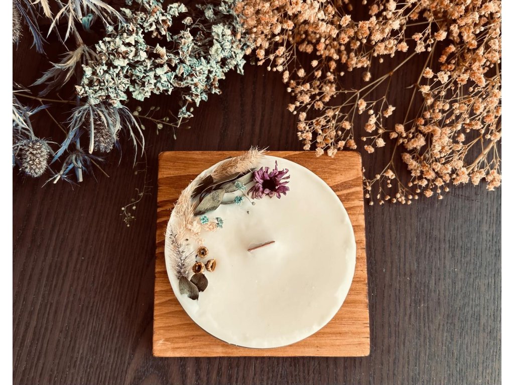 Originální ručně vyráběná svíčka ze 100% přírodního sójového vosku, zdobená sušenými květy a vybavená dřevěným knotem. Při hoření vydává jemný plamínek, který doprovází tiché praskání připomínající krbové dřevo – ideální pro chvíle klidu a relaxace.