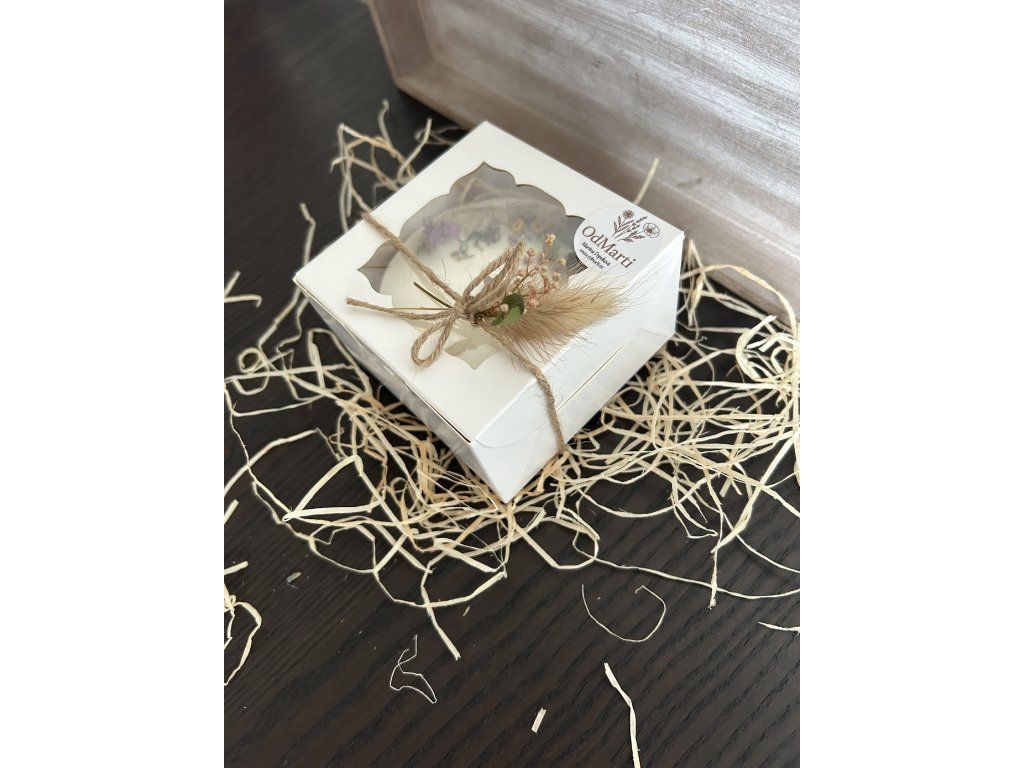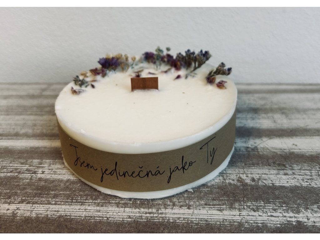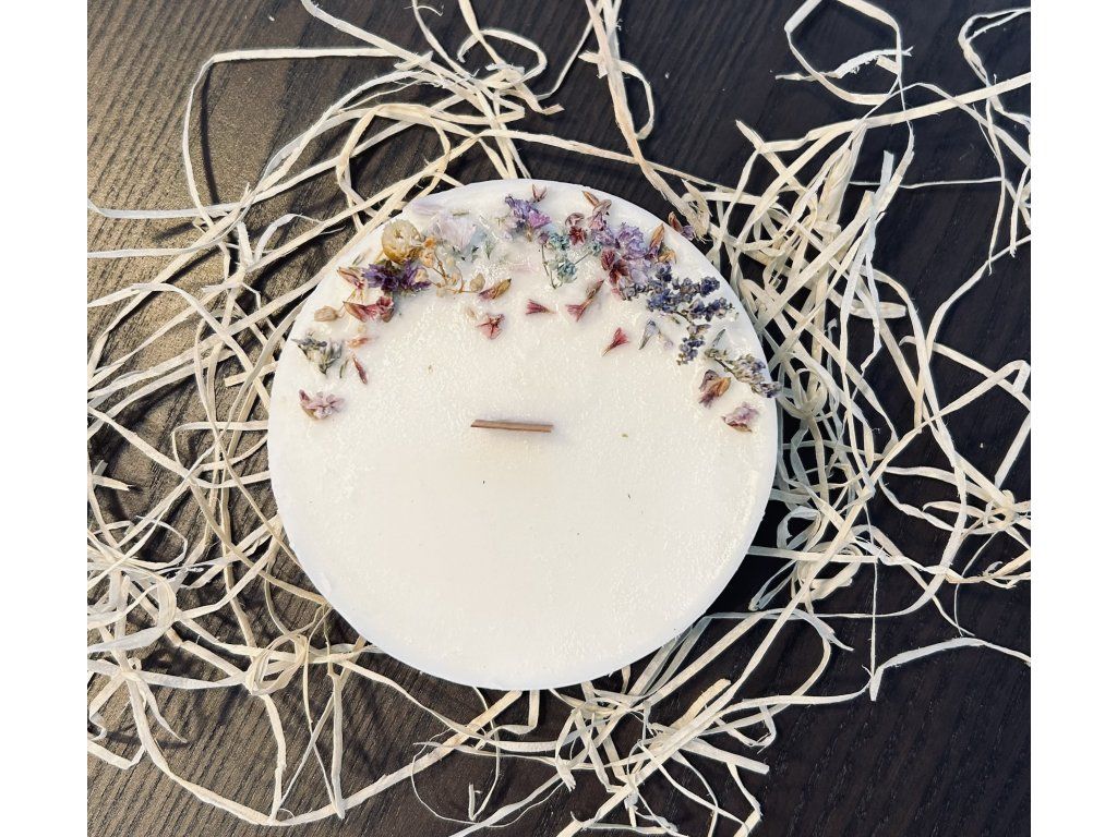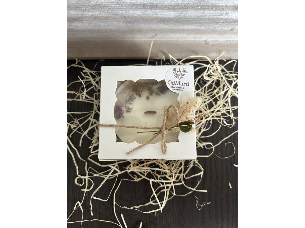 Bez parfemace a barviv. Průměr 9cm a výška 3,5cm. Ke svíčce patří i dárkové balení.
