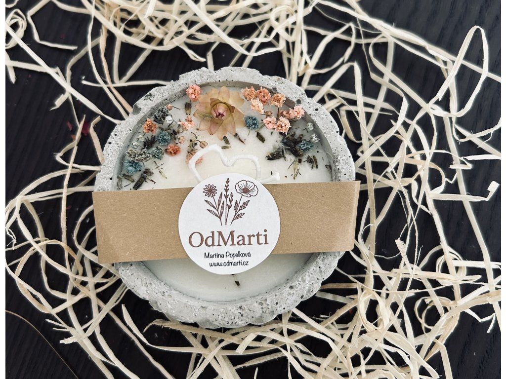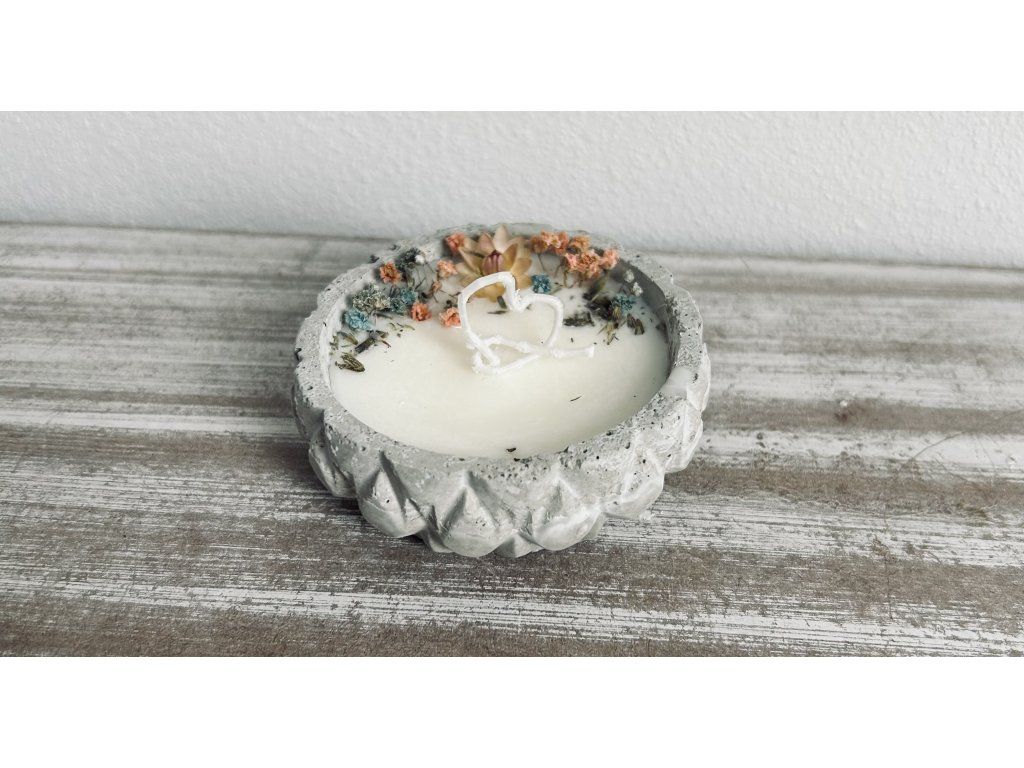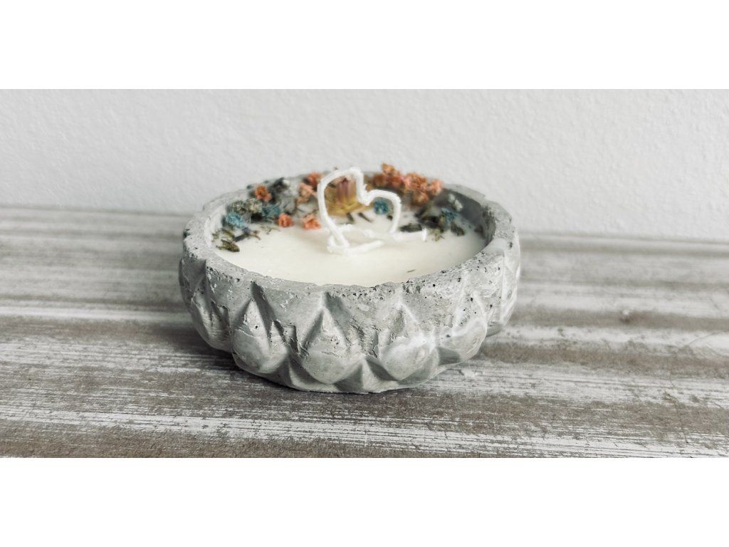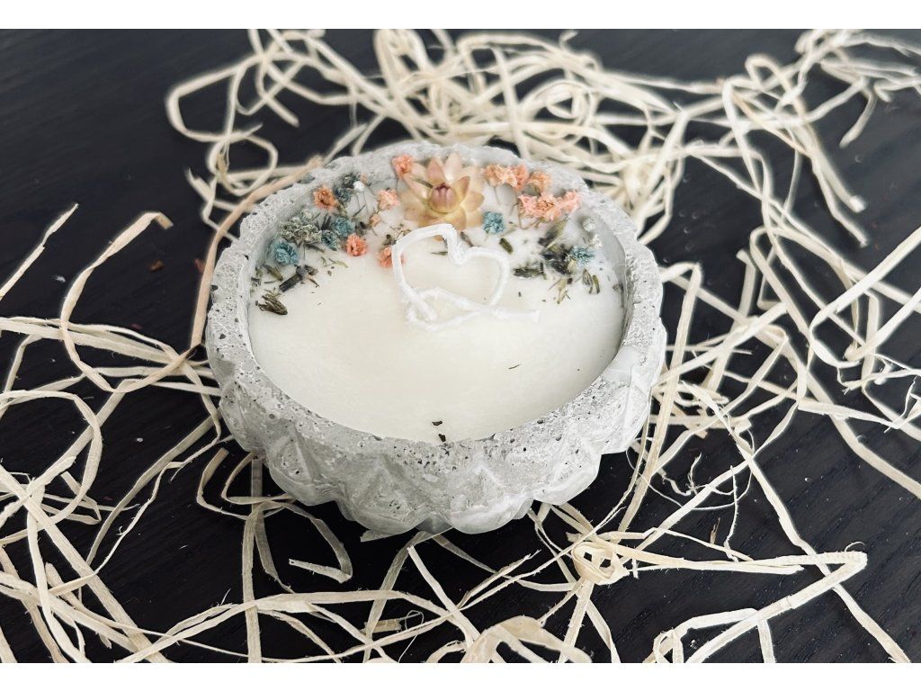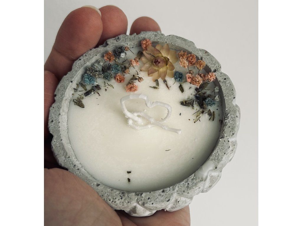 Sójová svíčka z kvalitního vosku, vložená do ručně dělané misky z betonu.. Svíčka je doplněna sušenými květy, které podtrhují její přírodní charakter. Každý kus je originál a vnese do Vašeho interiéru klidnou a relaxační atmosféru.