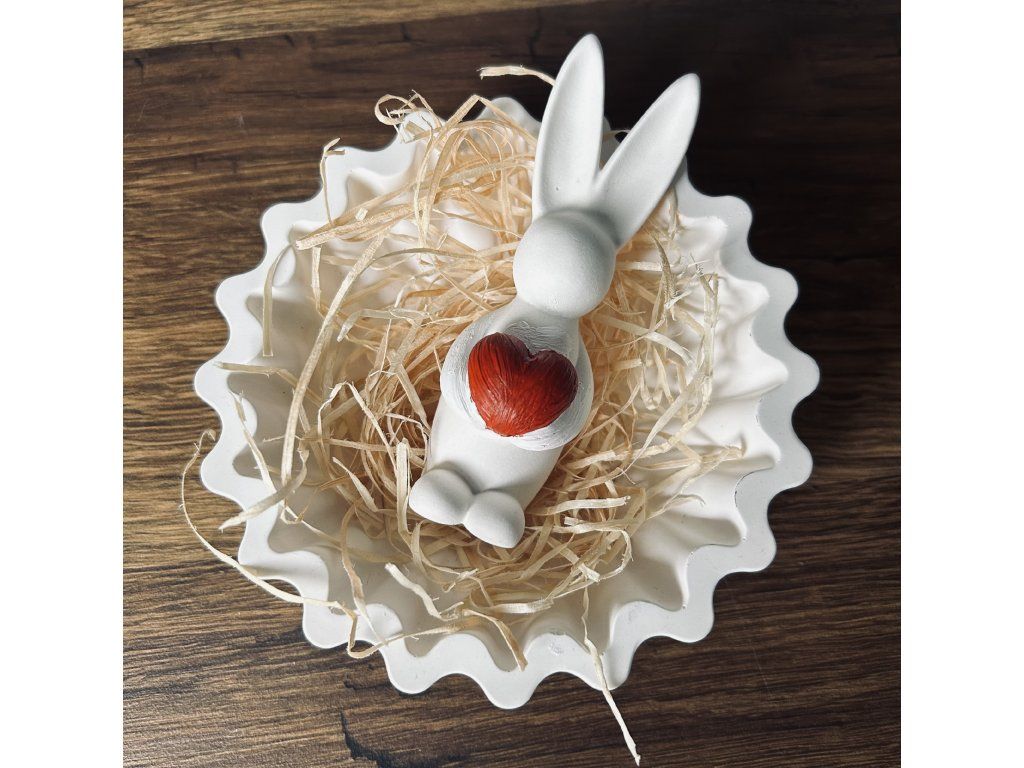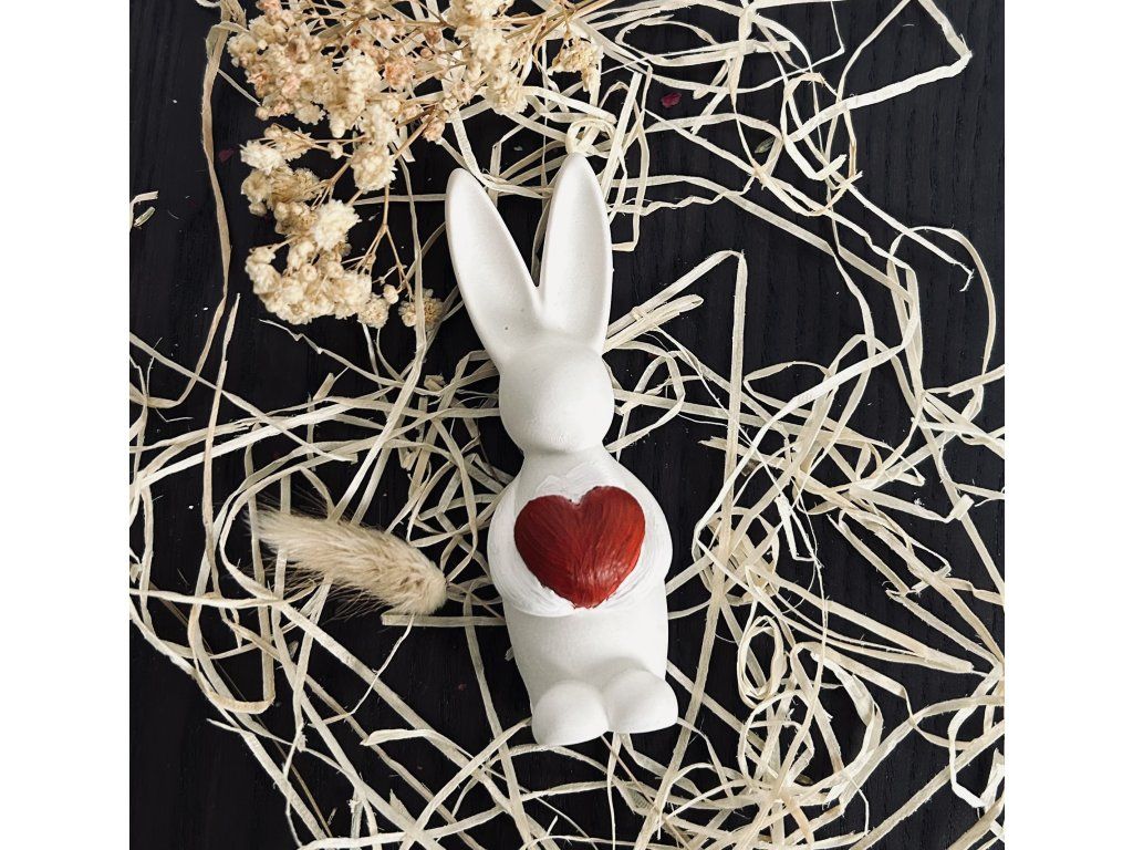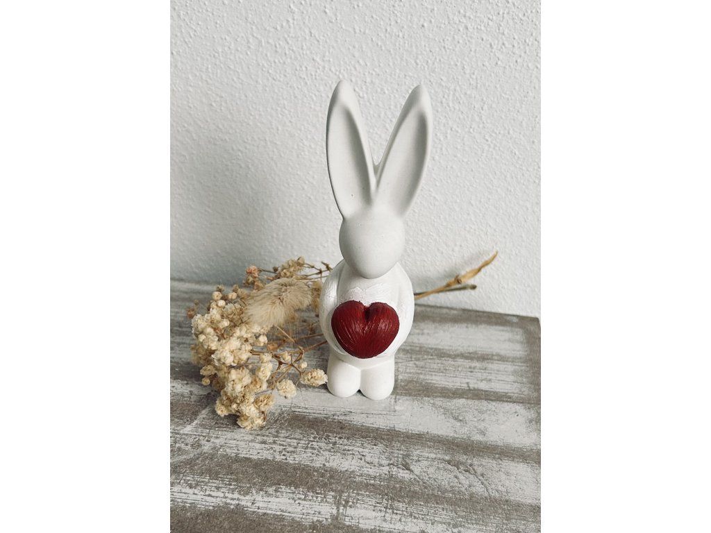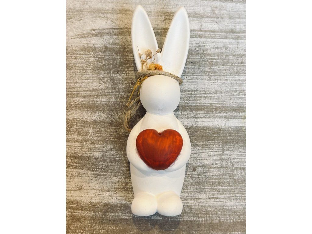 Malá dekorativní soška zajíce držícího srdce je symbolem lásky, jara a velikonoc. Zajíc je vyroben z kvalitního keraflottu, který vyniká hladkým detailem a povrchem. Červeně barvené srdce je výrazný akcent, díky němuž je soška ideálním doplňkem nebo milým dárkem pro blízké.