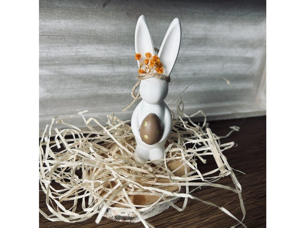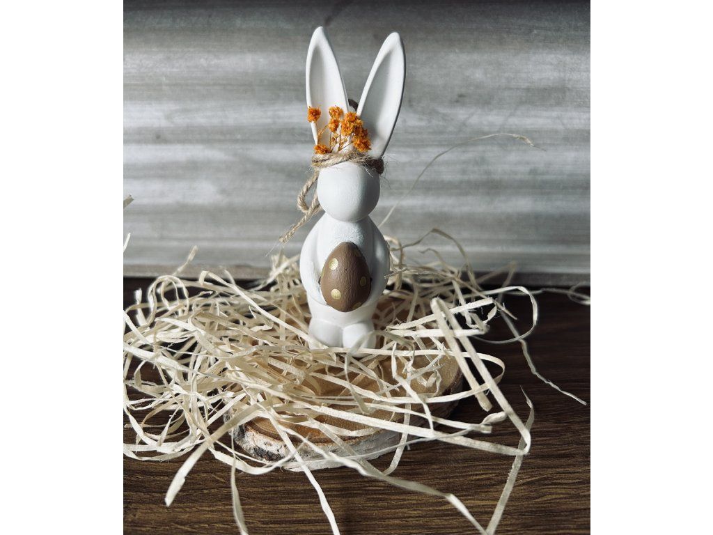 Malá dekorativní soška zajíce držícího vejce je symbolem jara a velikonoc. Zajíc je vyroben z kvalitního keraflottu, který vyniká hladkým detailem a povrchem. Barvené vejce je výrazný akcent, díky němuž je soška ideálním doplňkem nebo milým dárkem pro blízké.