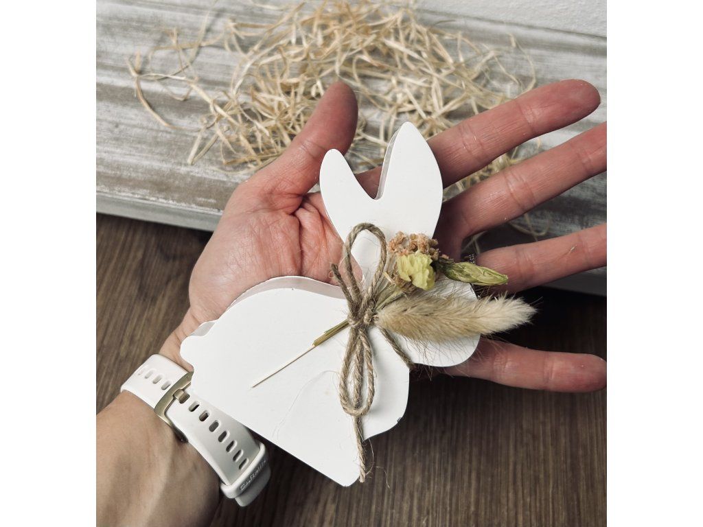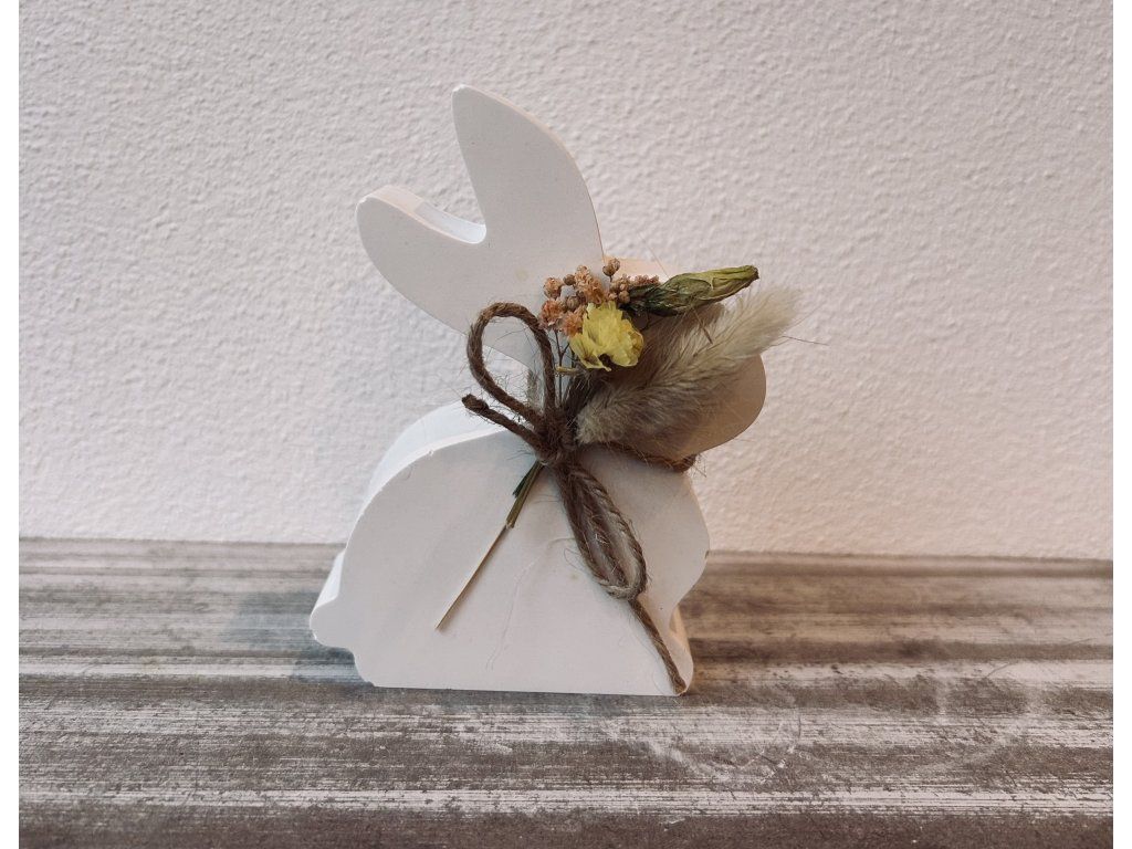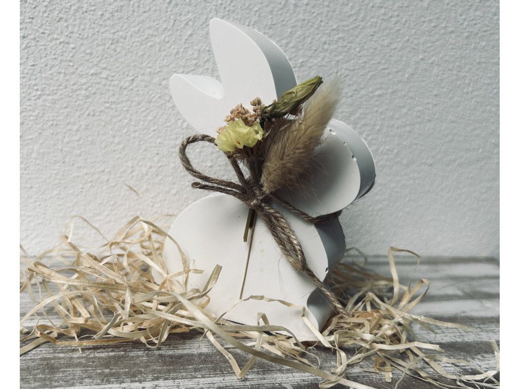 Dekorace ve tvaru zajíce je ručně vyrobená z kvalitního keraflottu, zdobený sušenými květinami. Dekorace má minimalistický design, díky kterému se hodí do každého interiéru.
