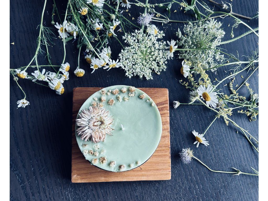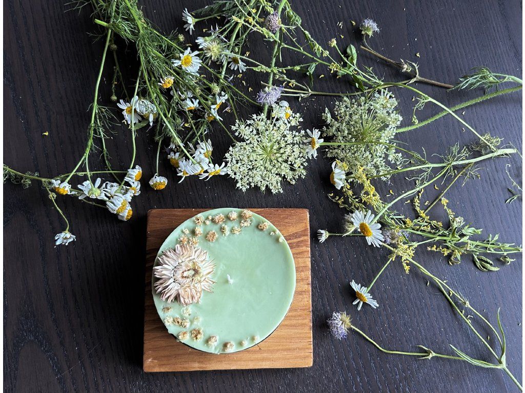 Originální ručně vyráběná svíčka ze 100% přírodního sójového vosku, zdobená sušenými květy.